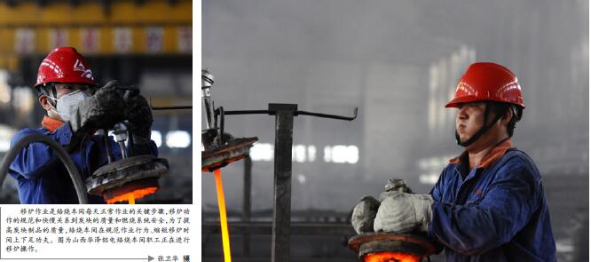 移炉作业是焙烧车间每天正常作业的关键步骤,移炉动作的规范和快慢关系到炭块的质量和燃烧系统安全,为了提高炭块制品的质量,焙烧车间在规范作业行为、缩短移炉时间上下足功夫。图为山西华泽铝电焙烧车间职工正在进行移炉操作。 张卫华 摄