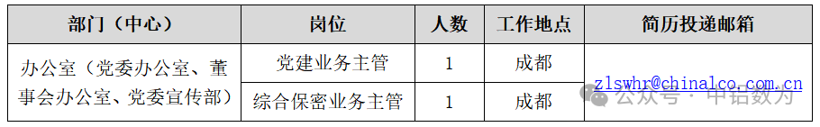 详见《中铝数为(成都)科技有限责任公司2026年面向中铝集团内部招聘岗位一览表(第六批)》(附件1)。