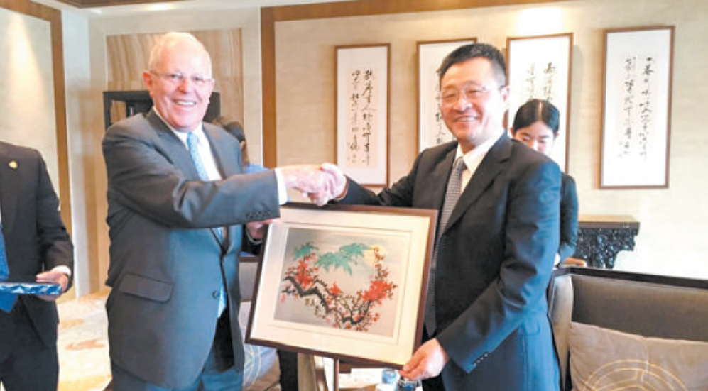 图为葛红林向秘鲁总统库琴斯基赠送铝板画。 刘东军摄