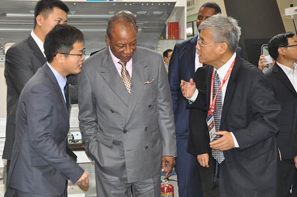 图为几内亚总统孔戴在中铝公司展台前听取中铝公司总经理助理丁海燕介绍相关情况。 吴 纯 摄