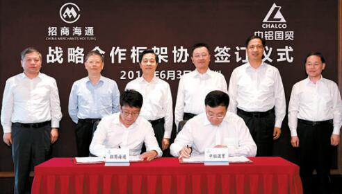 本网讯 6月3日,中铝国际贸易有限公司与招商局海通贸易有限公司在深圳签署战略合作框架协议。中铝公司党组书记、董事长葛红林,招商局集团有限公司董事长李建红见证签约并举行会谈。签约仪式由招商局集团财务总监付刚峰主持。