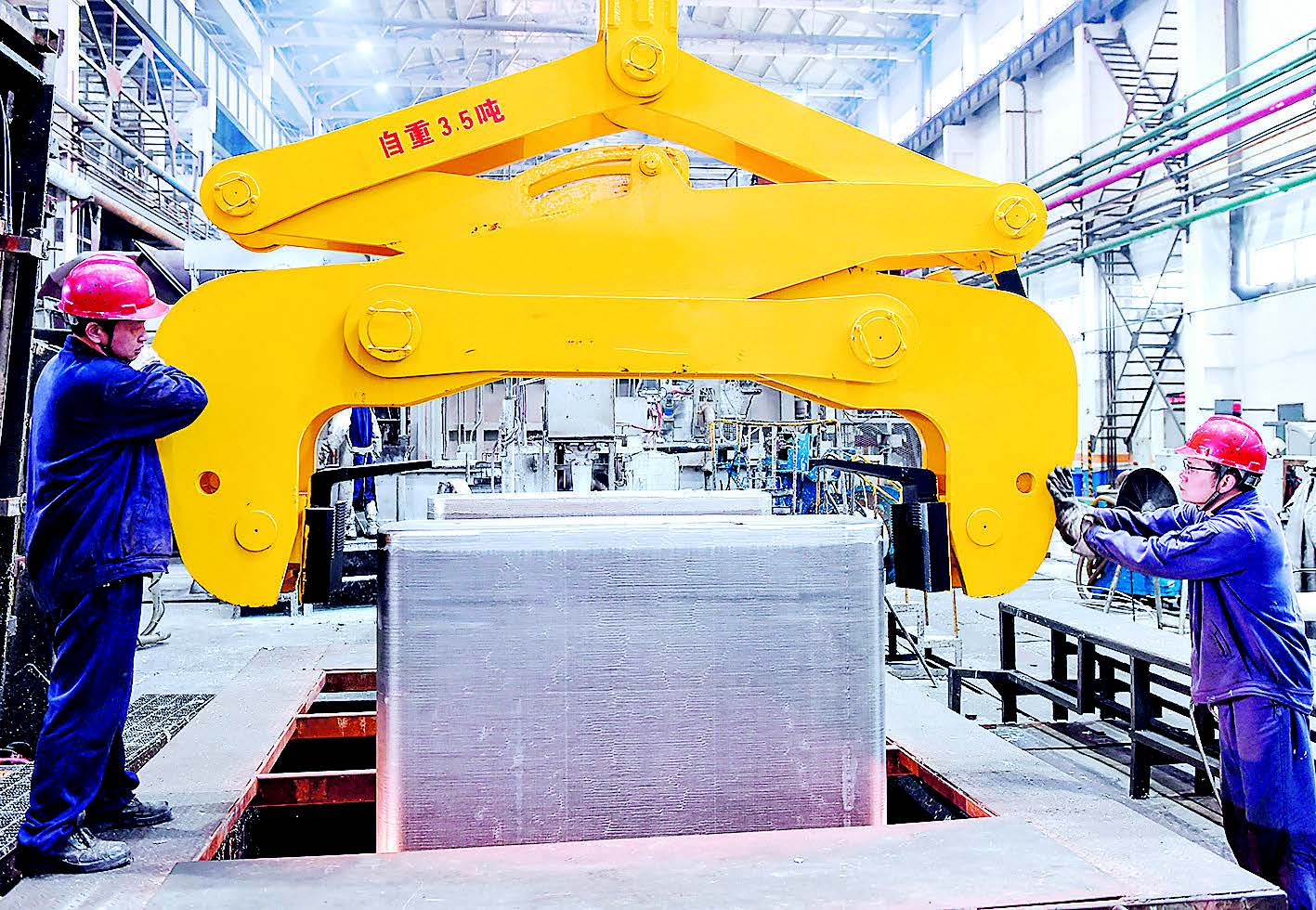 本网讯 近日,西南铝成功试制某超大规格2xxx航空铝合金材料,标志着该公司在高精尖铝合金的开发和研究上又前进了一大步。据了解,该铝合金材料属于国内首次试制,具有强度高、拉伸性能好、抗蚀能力好等优点。图为西南铝熔铸厂员工吊运刚铸造出的铝合金铸锭。